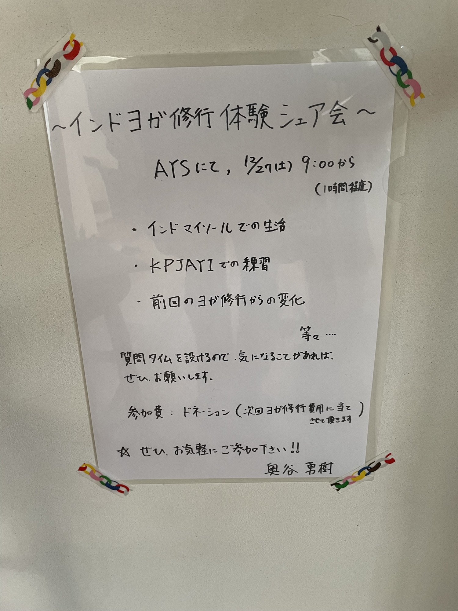 インドヨガ修行の体験をシェアする会の告知をした。