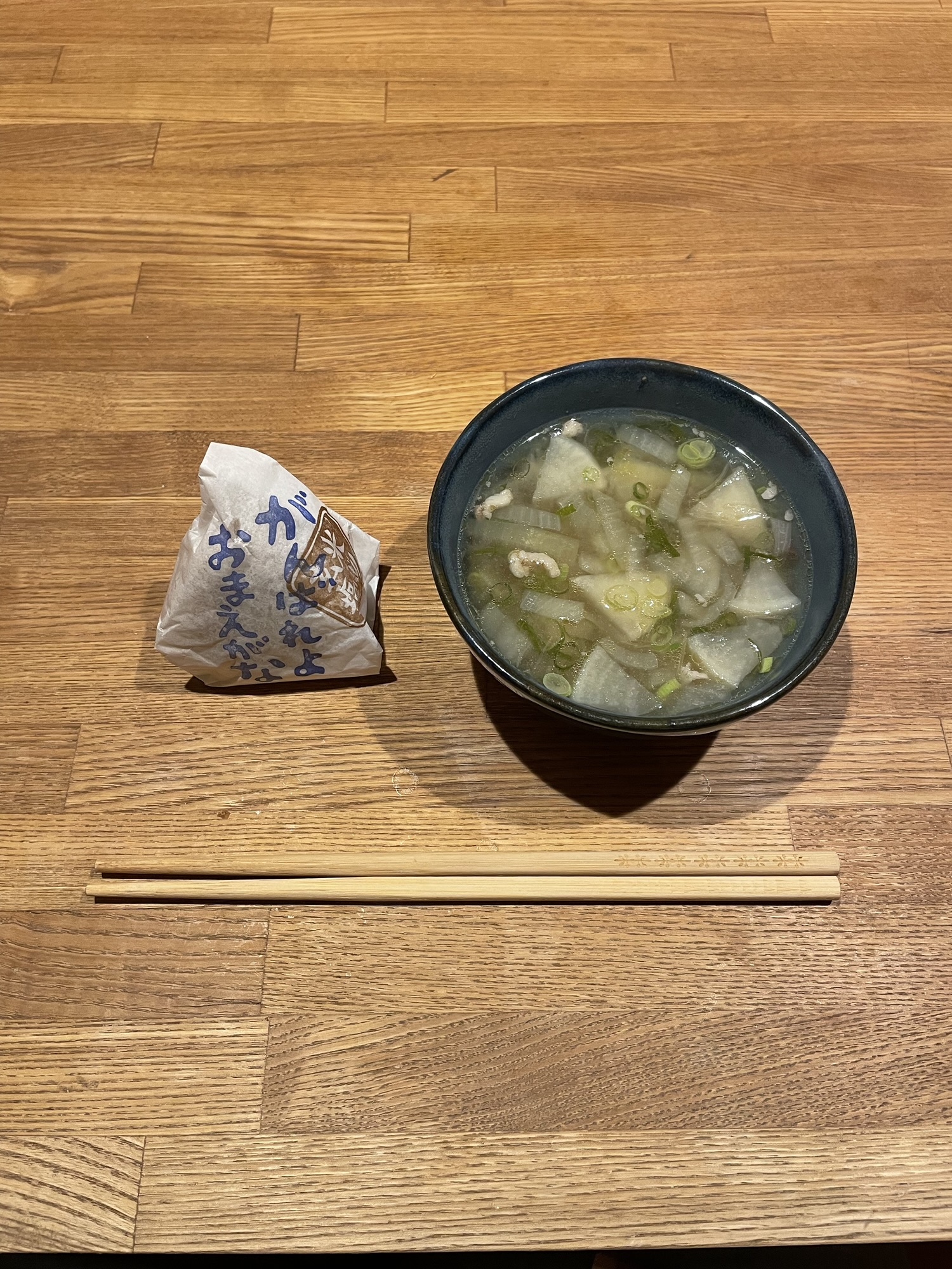 本日1食目。おにぎり定食。たらこと鶏そぼろをチョイス。