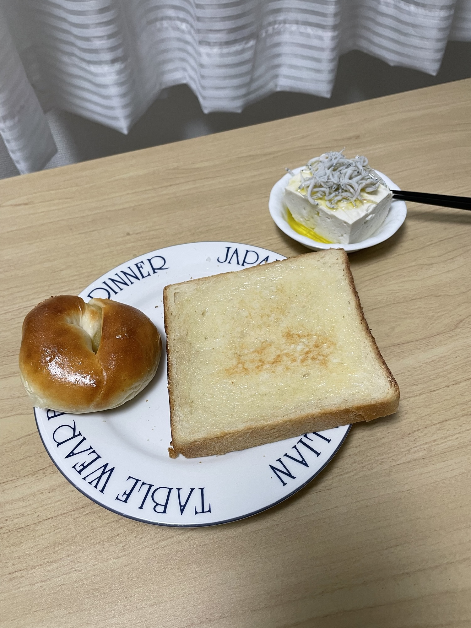 本日の夕飯。食パン、栗パンとしらす豆腐