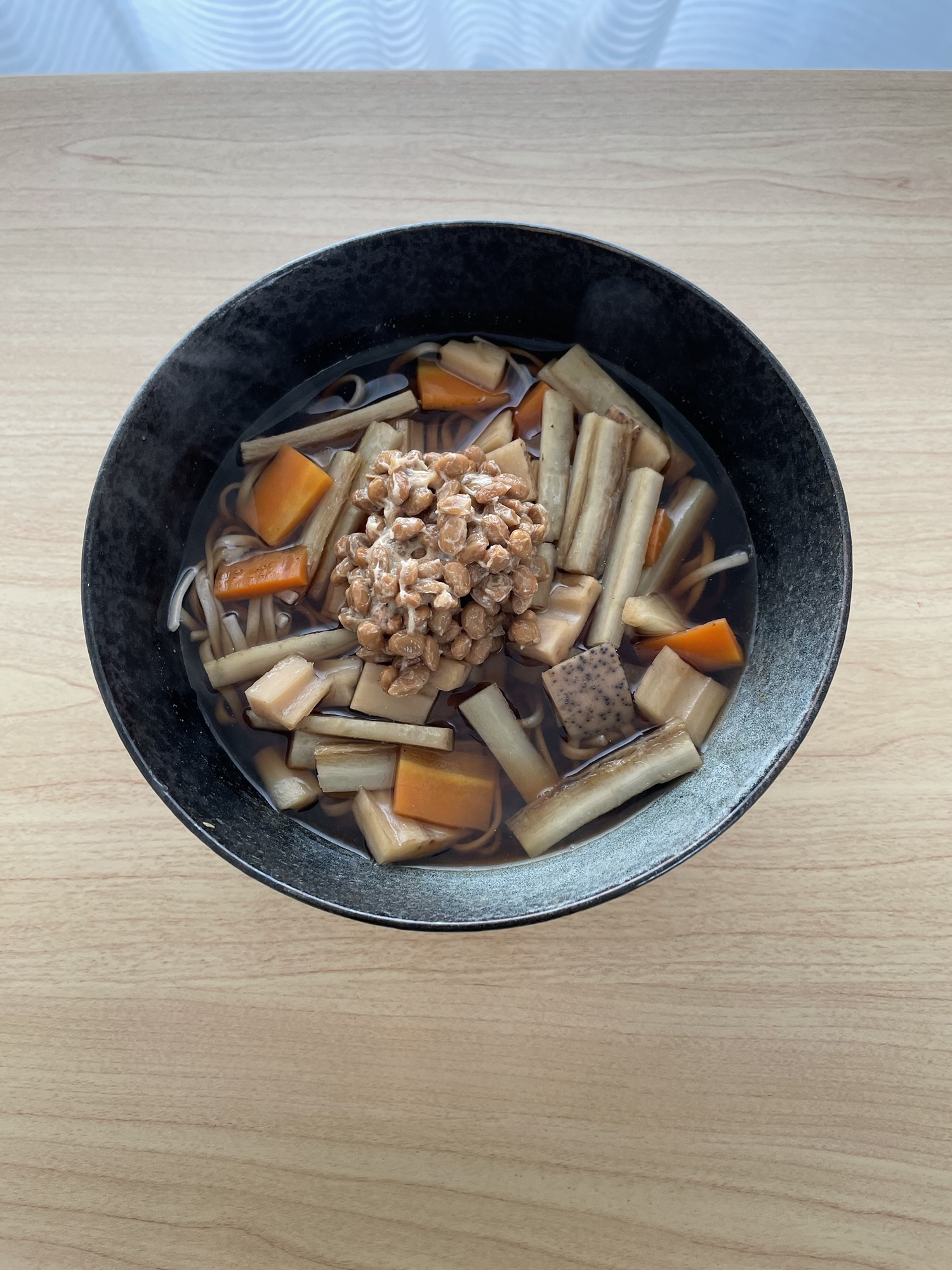 具材は、人参、ごぼう、蓮根、カブ、納豆。